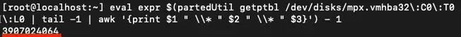 eval expr $(partedUtil getptbl /dev/disks/mpx.vmhba32\:C0\:T0\:L0 | tail -1 | awk '{print $1 " \\* " $2 " \\* " $3}') - 1