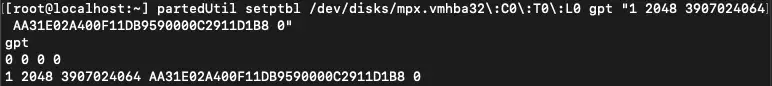 partedUtil setptbl /dev/disks/mpx.vmhba32\:C0\:T0\:L0 gpt "1 2048 3907024064 AA31E02A400F11DB9590000C2911D1B8 0"