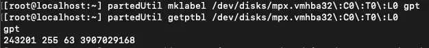 partedUtil getptbl /dev/disks/mpx.vmhba32\:C0\:T0\:L0