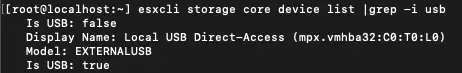 esxcli storage core device list |grep -i usb看到(Is USB: ture)表示移动硬盘已经被识别